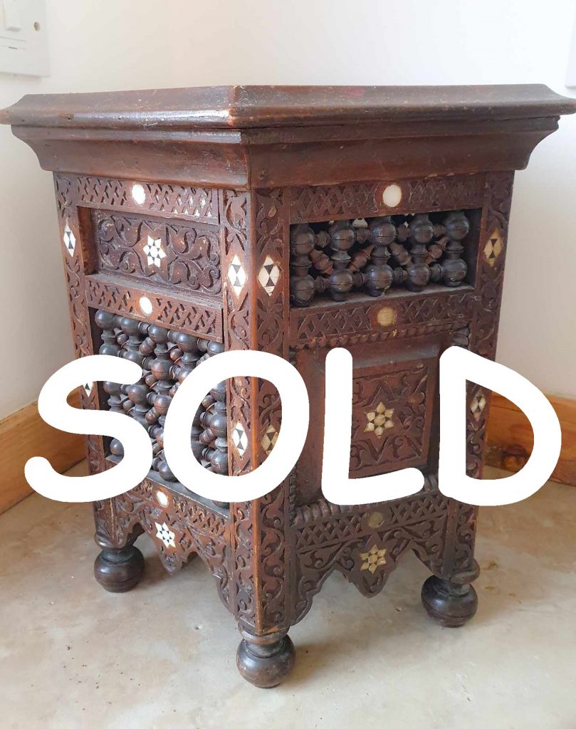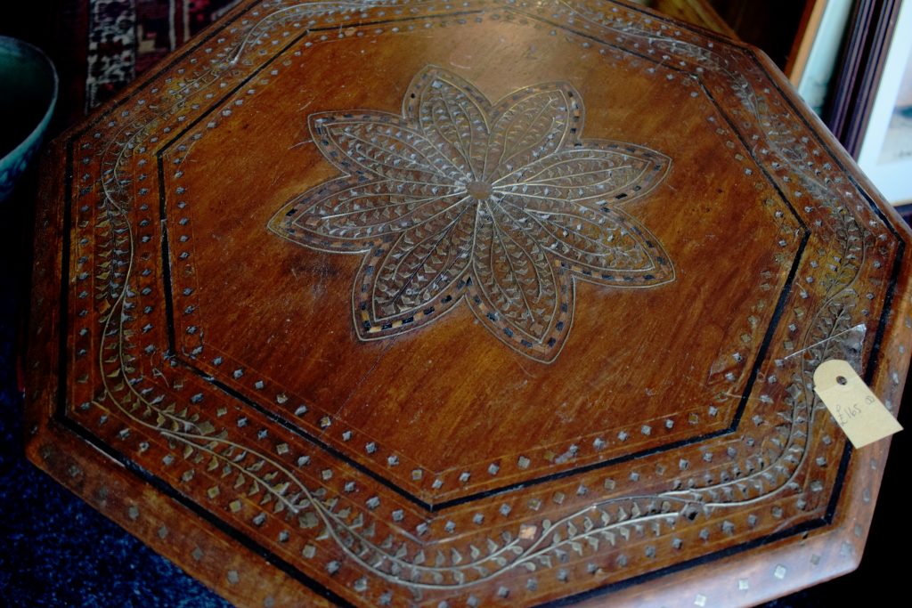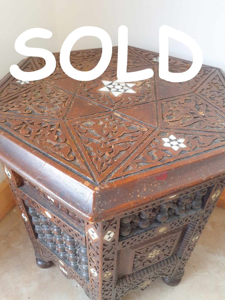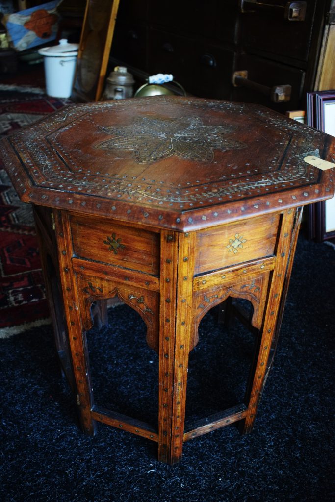Beautiful indian table, made from indian hard wood with brass inlay. Top of the table disconnects and the bottom can be folded. Size: H50cm W50cm D50cm