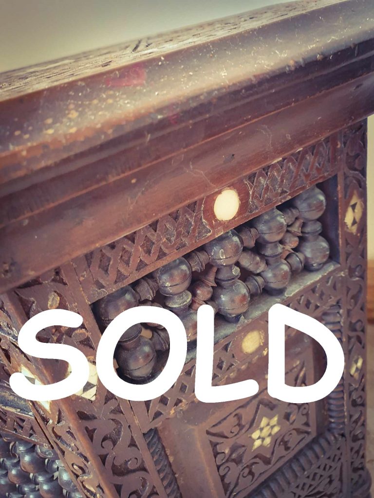 Beautiful indian table, made from oak. Hand carved with Jali detail and bone inlay. Size: H86cm W90cm D40cm