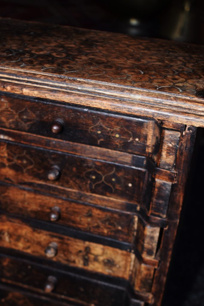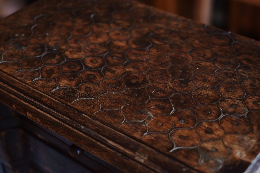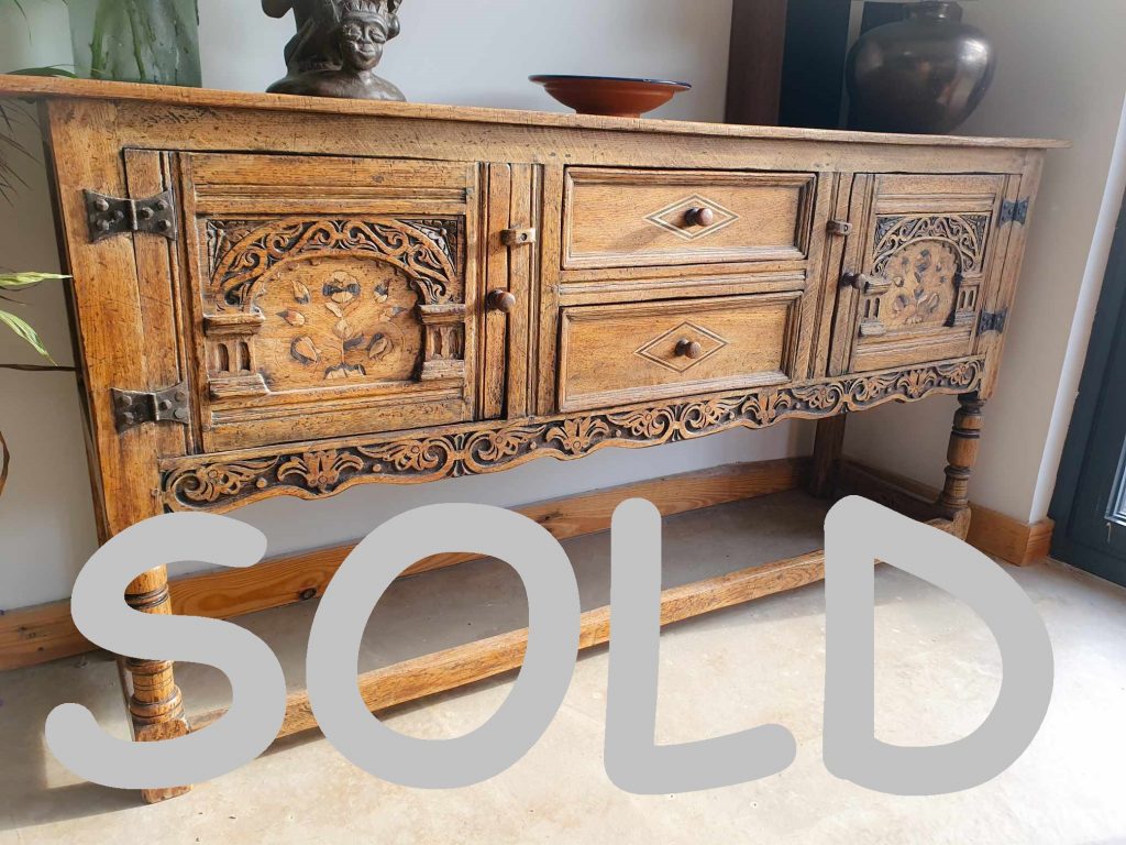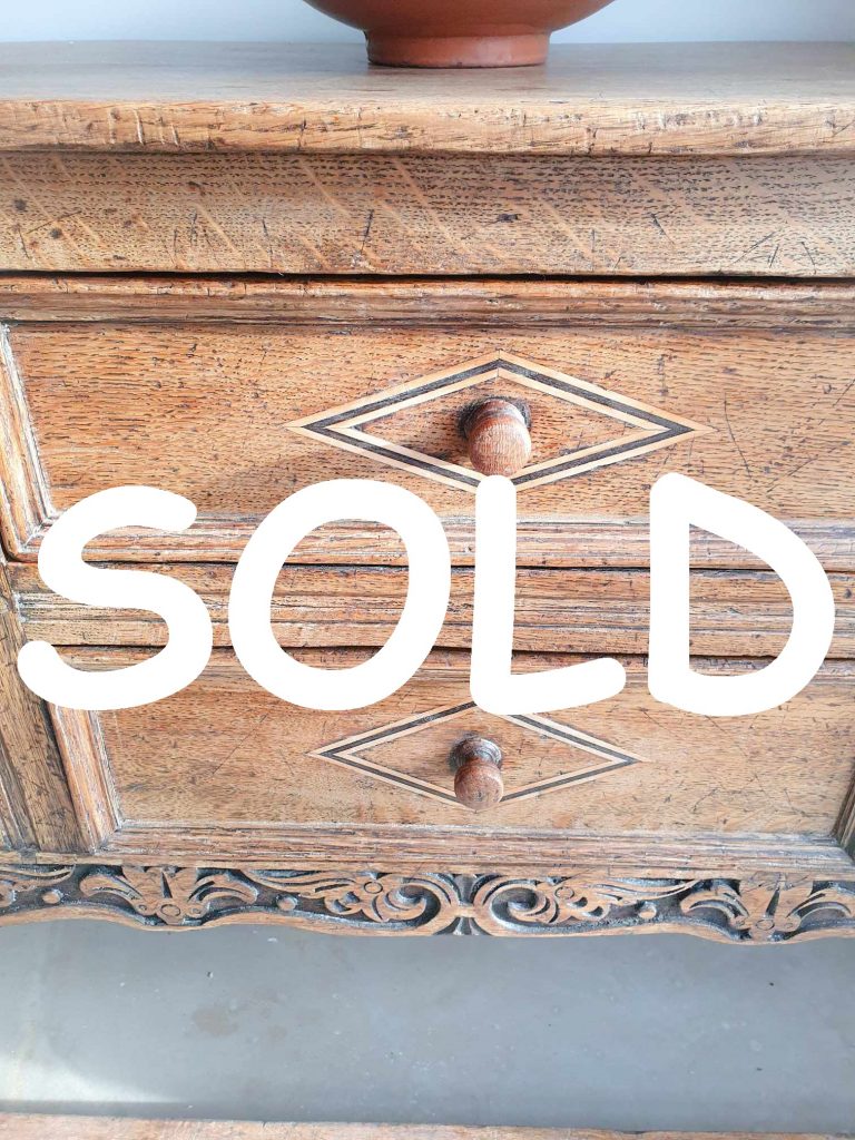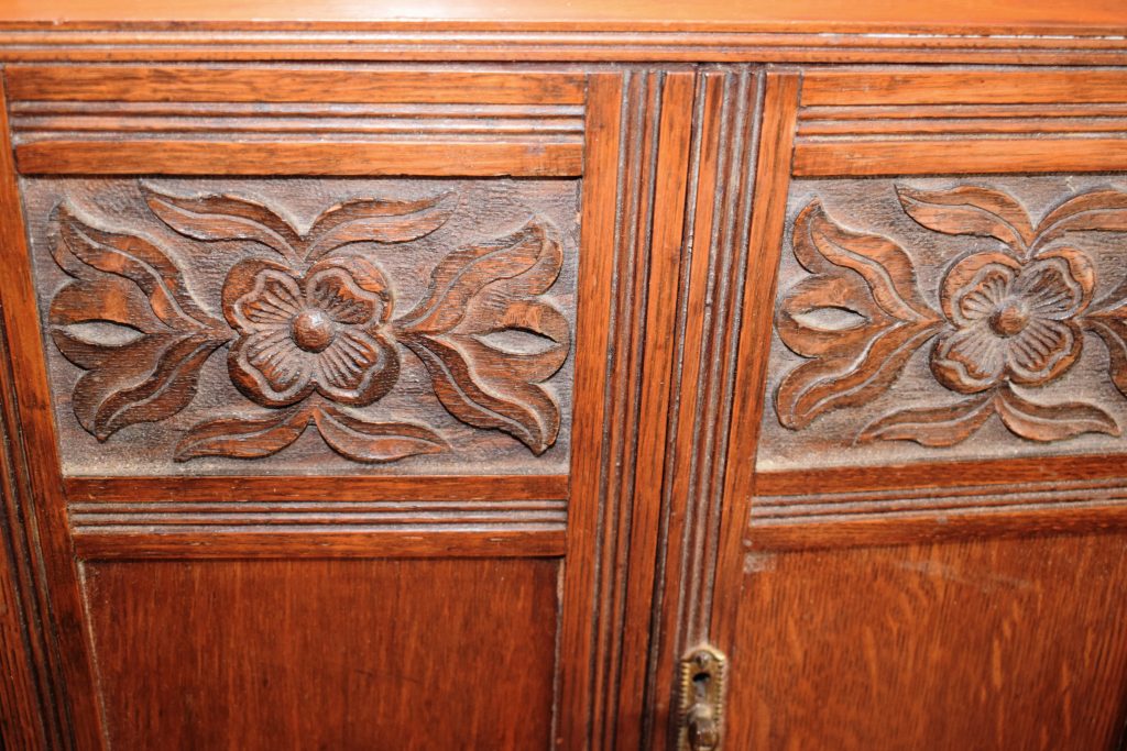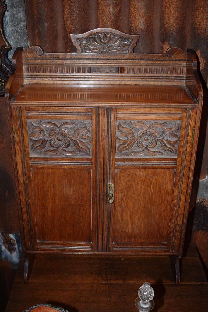 Victorian side unit, made with oak. Hand carved detailing and metal hinges. Inlayed bone and ebony. Size: H86cm W90cm D40cm