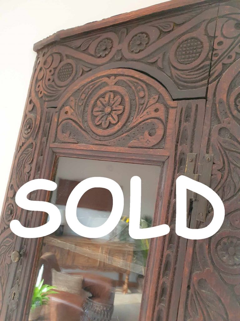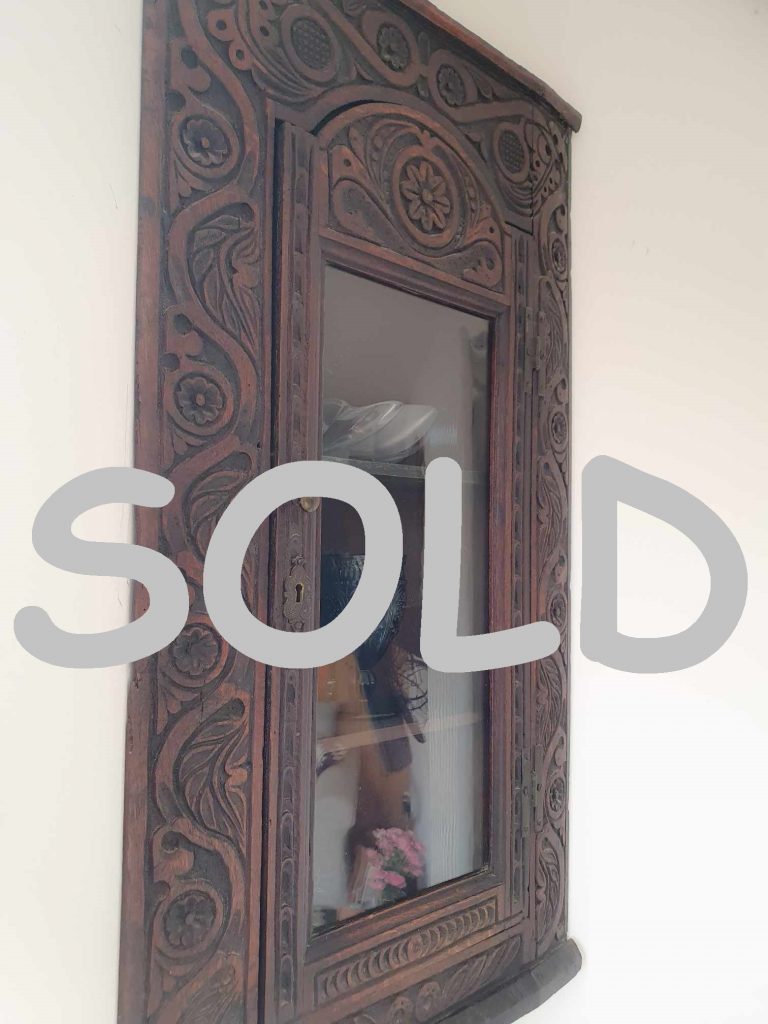 Beautiful corner unit made from oak. Hand carved and 3 shelves inside. Size: H86cm W90cm D40cm
