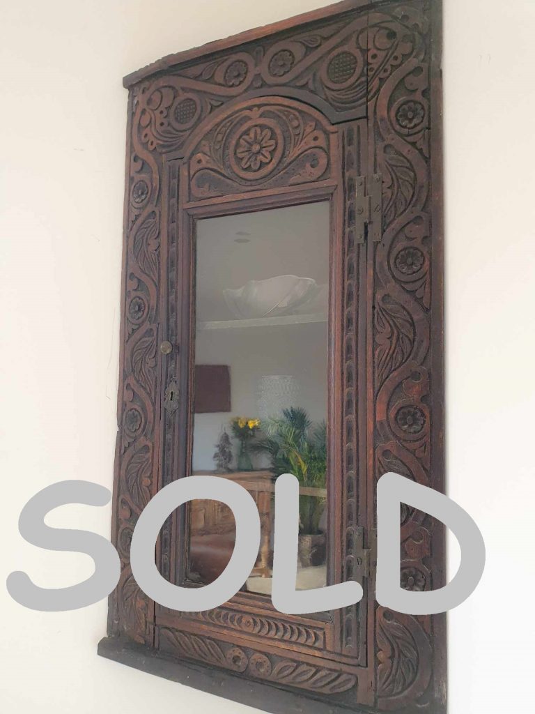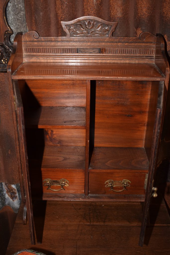 Hand carved oak cabinet, from the early 1900’s opening front doors with 3 compartments and two drawers on the inside. Metal embelishments on front door and drawers. Size: H60cm W40cm D15cm