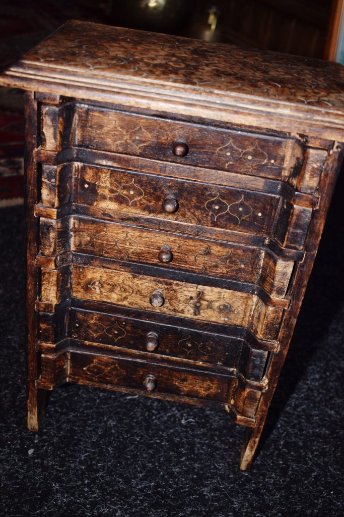 Beautiful indian drawers, made from teak wood with fine brass inlay for detail. Size: H38cm W25cm D15cm
