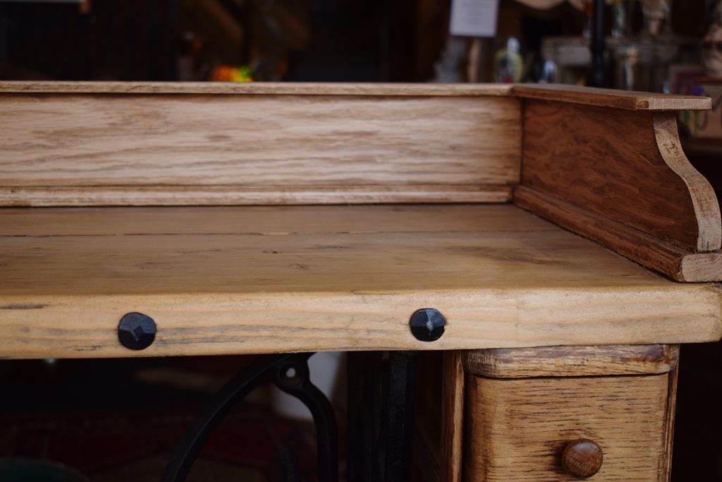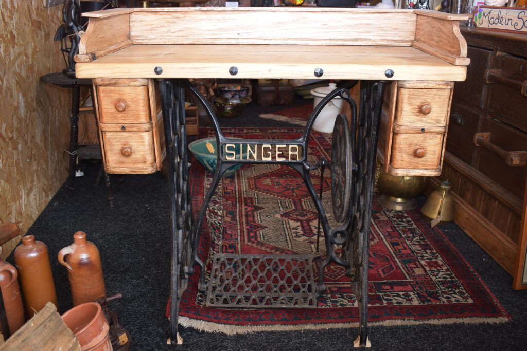 1940’s classic singer sewing maching table which has been repurposed with a new oak top and gallery added round the edges, would make the perfect hall table. Size: H86cm W90cm D40cm