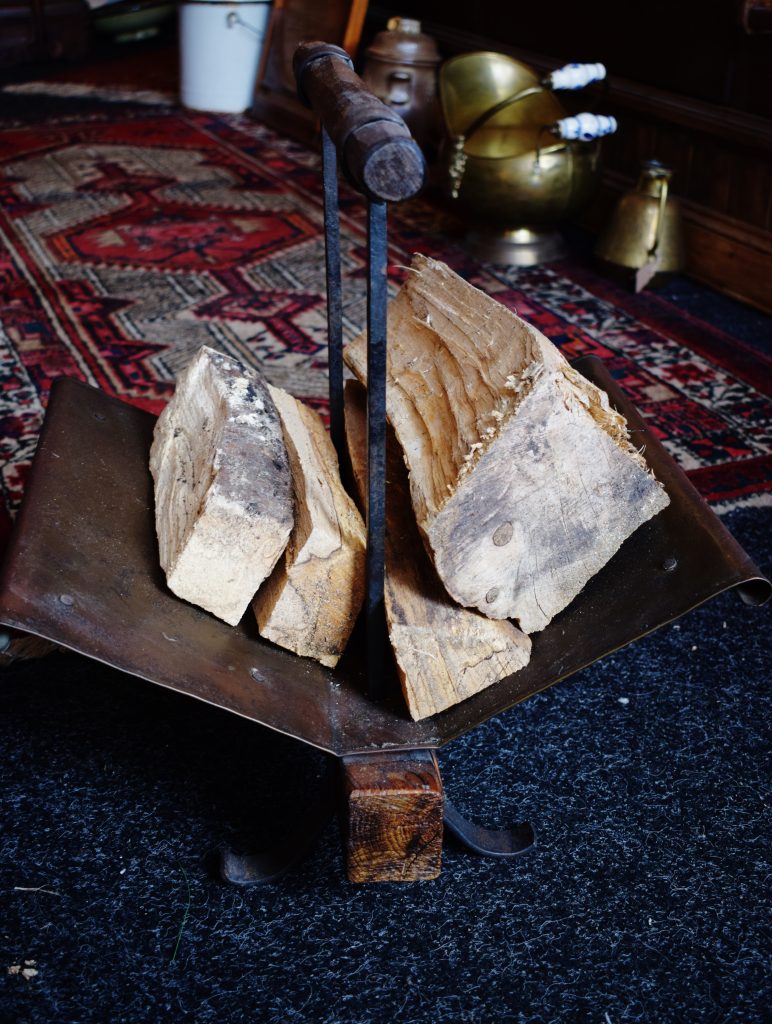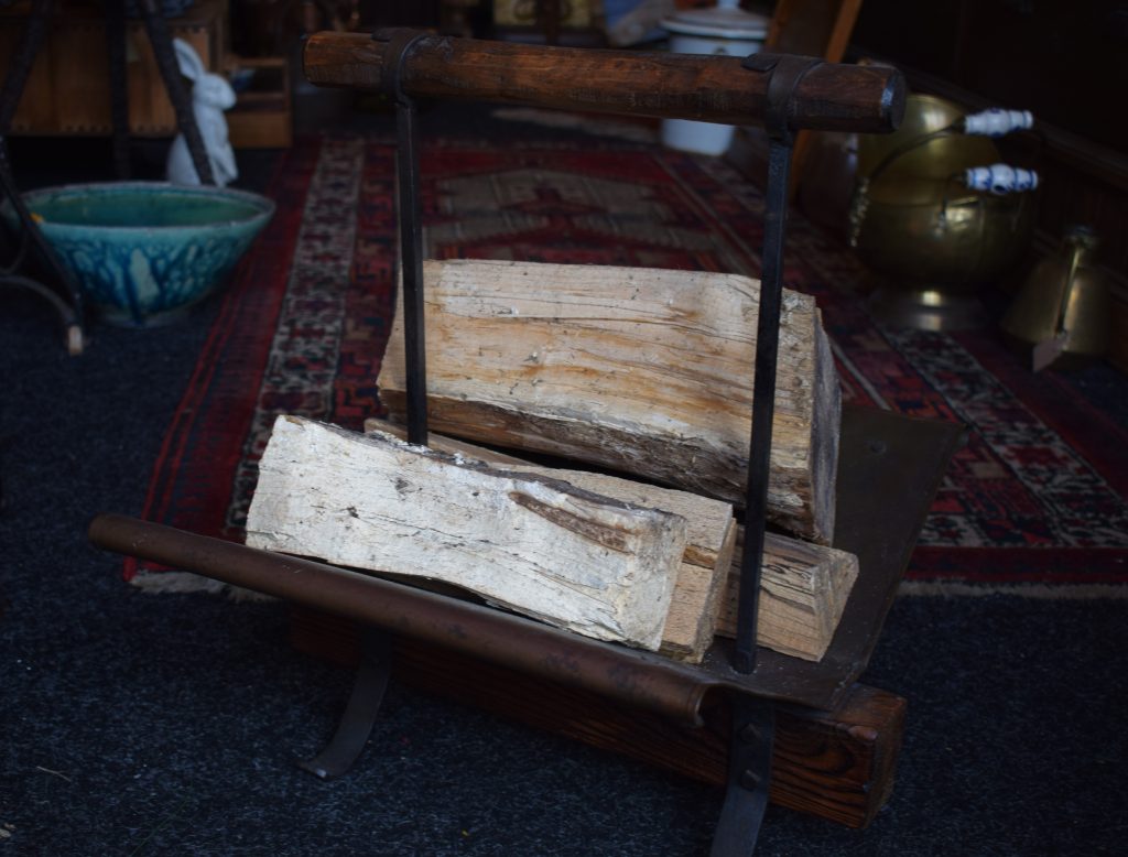 Early 1900’s log basket, made from brass and soft wood handle and base. Size: H52cm W34Cm