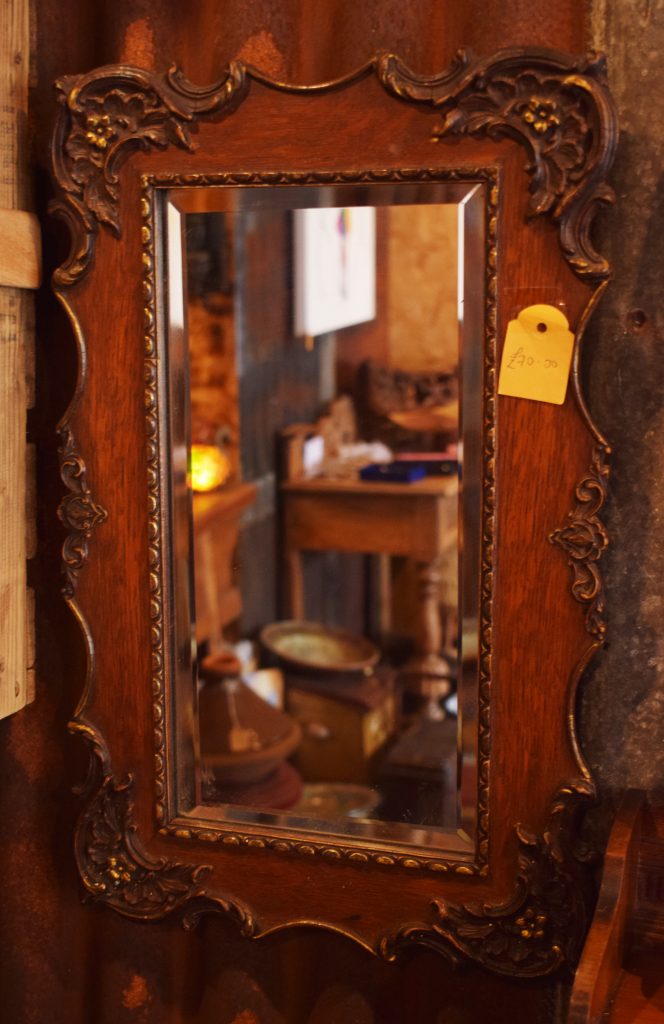 Victorian oak mirror with guilded carved border. Bevelled mirroed glass. Size: H52cm W34Cm