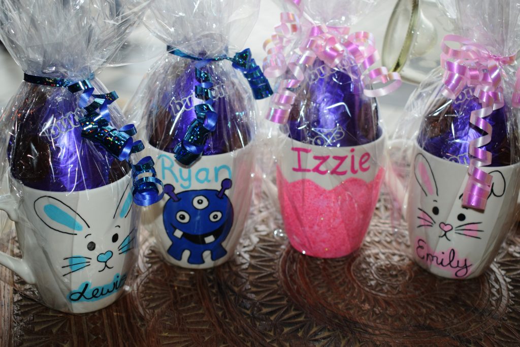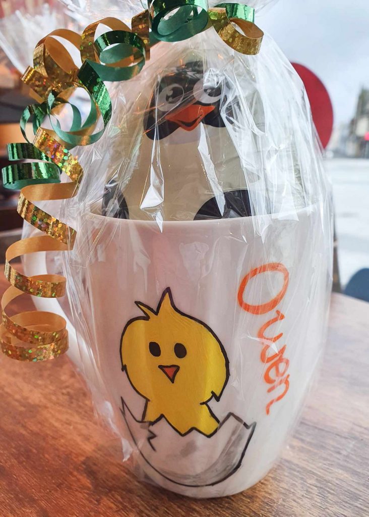 Personalised Mug with chocolate egg, wrapped with coordinating ribbon.