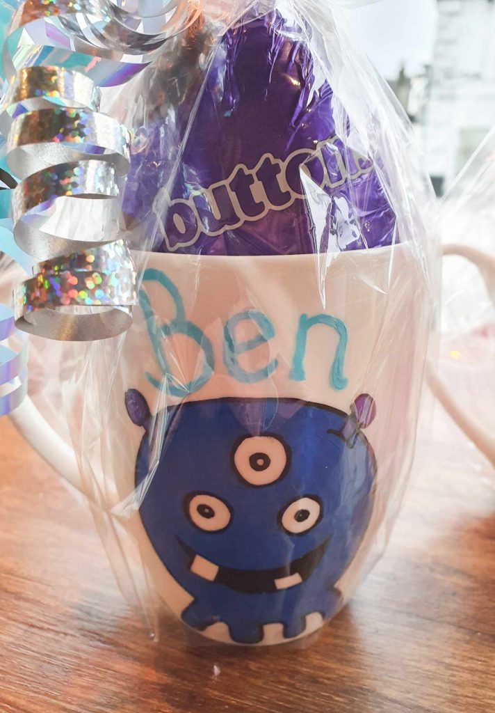 Personalised Mug with Monster and chocolate egg, colour of monster can be changed. wrapped with coordinating ribbon.
