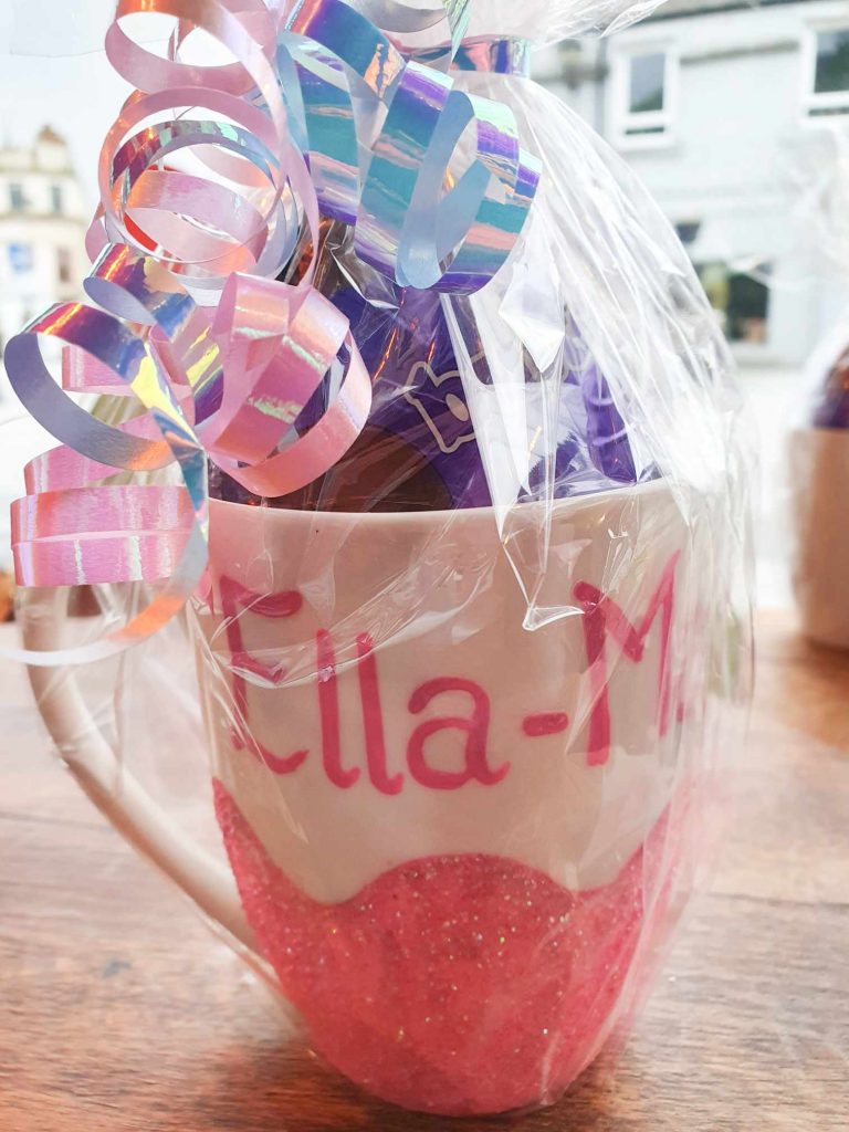 Personalised Glitter Mug and chocolate egg, colour of glitter can be changed. wrapped with coordinating ribbon.